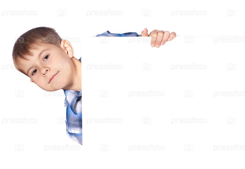 Мальчик с чистым листом бумаги на белом фоне