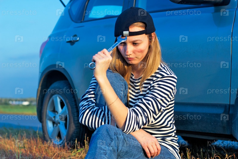 Блондинка у сломанной машины