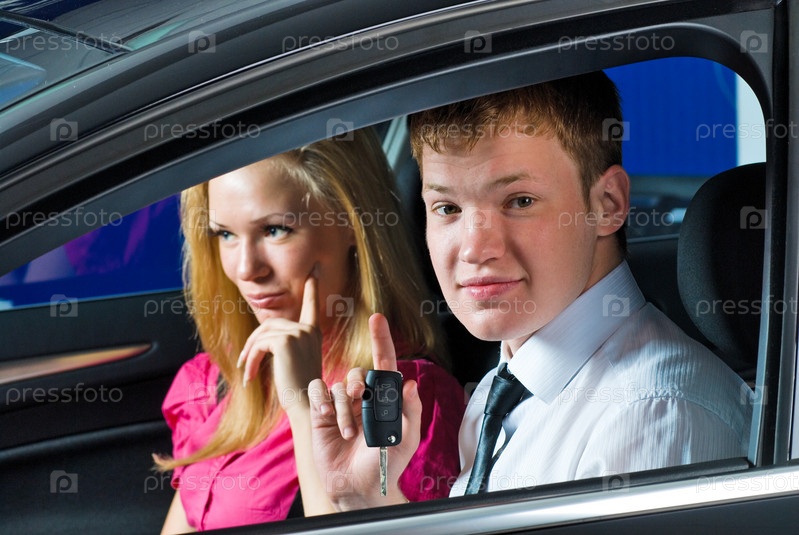 Счастливая молодая пара сидит в черном автомобиле