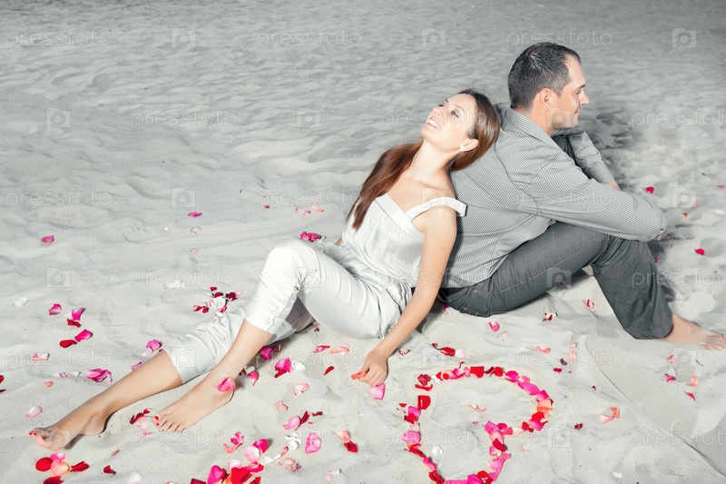 Влюбленная пара сидит на песке