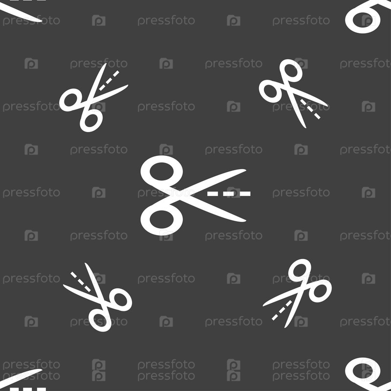 Ножницы с вырезать штрих пунктирной линии знак значок. Портной символ. Бесшовный узор на сером фоне. Вектор