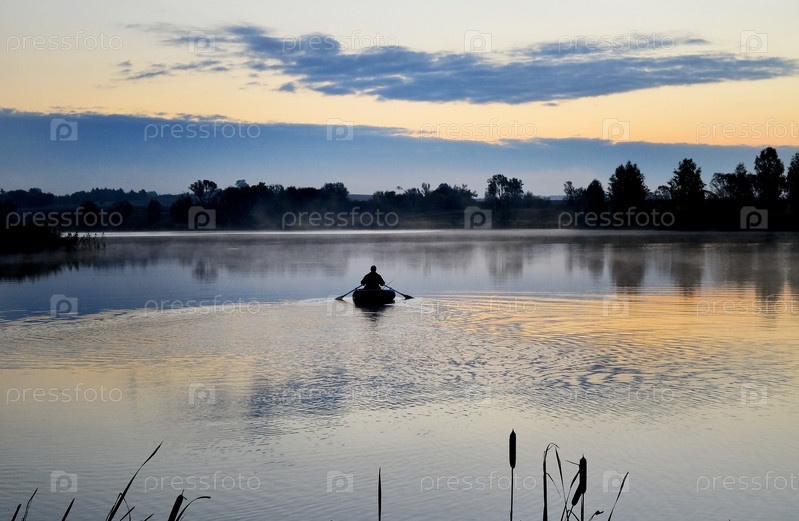 Рыбак в лодке в утреннем тумане