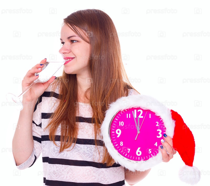 Красивая молодая женщина с часами и бокал шампанского