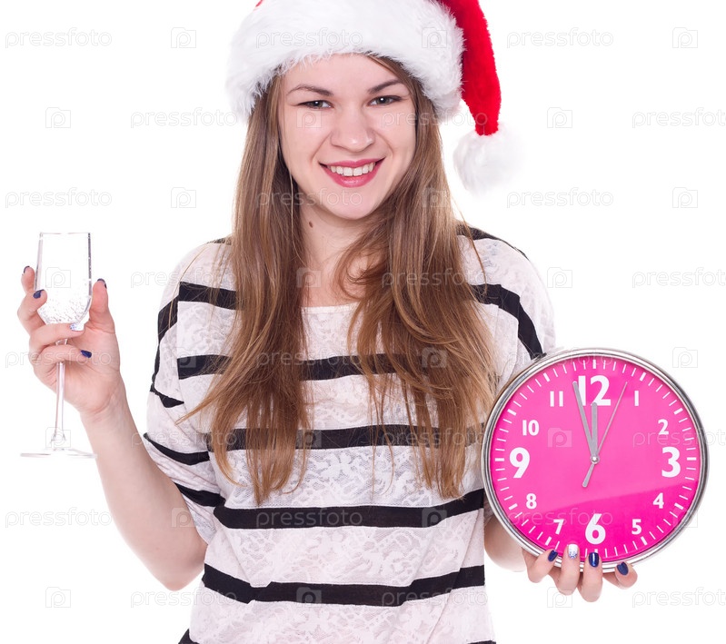 Красивая молодая женщина с часами и бокал шампанского