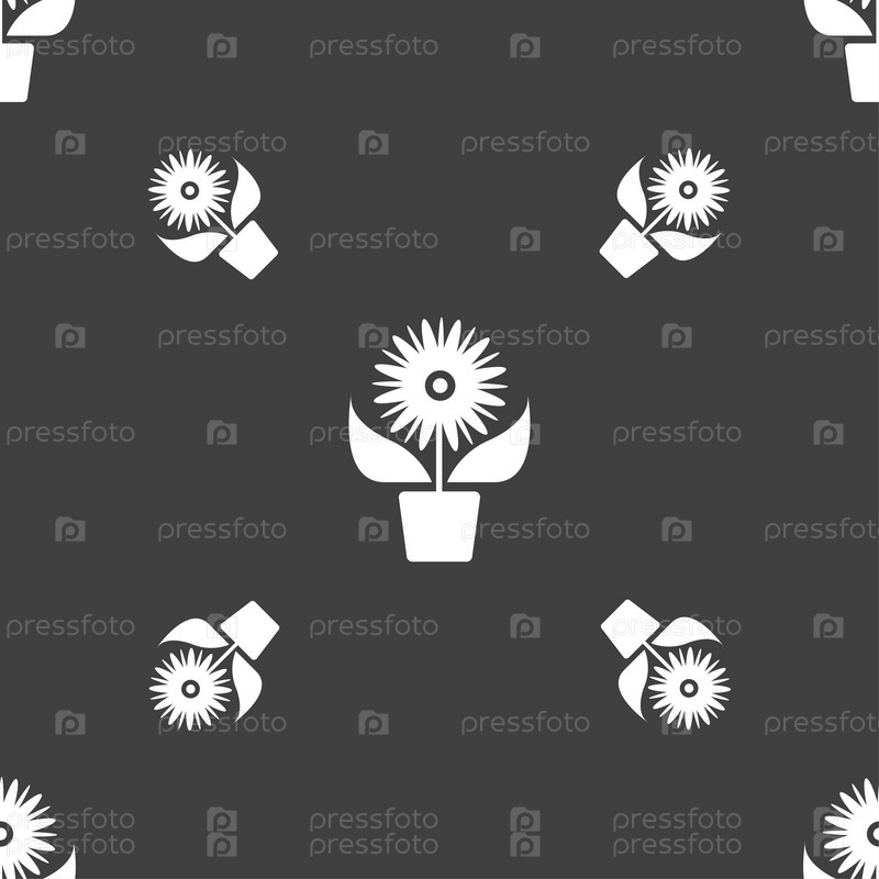 Цветы горшок значок знак. Бесшовный узор на сером фоне. Вектор