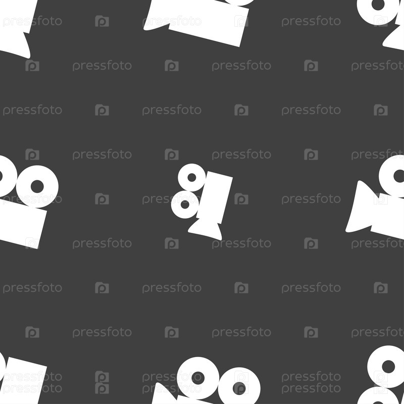 Иконка Видеокамера знак. Кнопка «содержимое». Бесшовный узор на сером фоне. Вектор