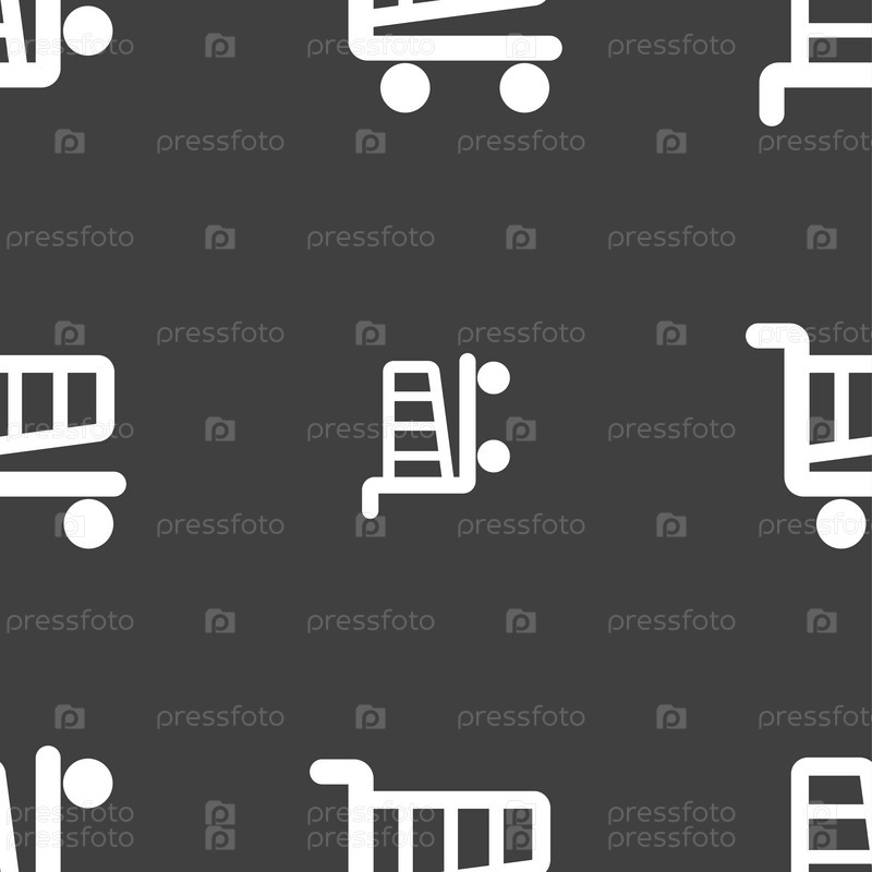 Торговый знак значок Корзина. Онлайн Покупка кнопку. Бесшовный узор на сером фоне. Вектор