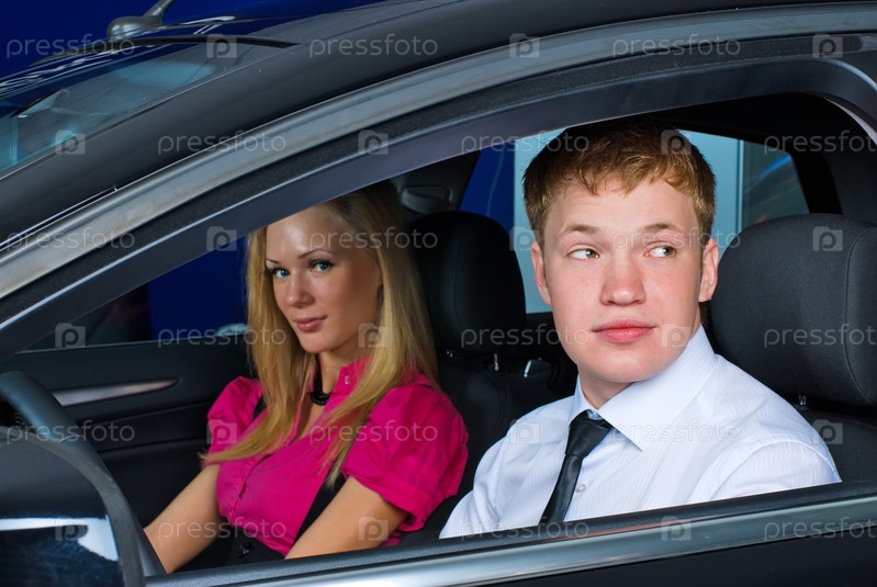 Молодая пара сидит в черном автомобиле