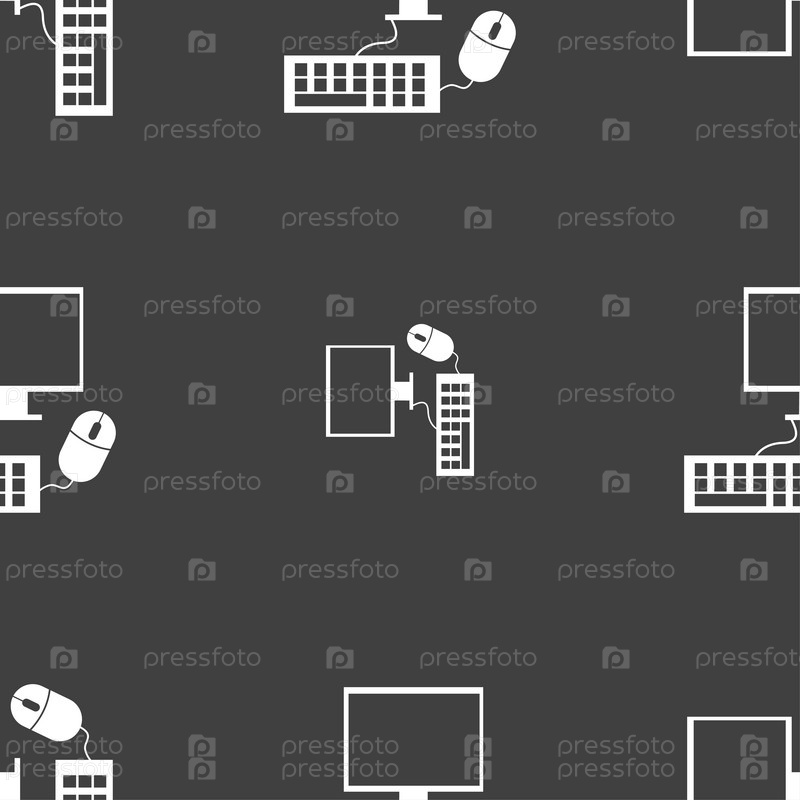 Широкоформатный монитор, клавиатура, мышь. Бесшовный узор на сером фоне. Вектор