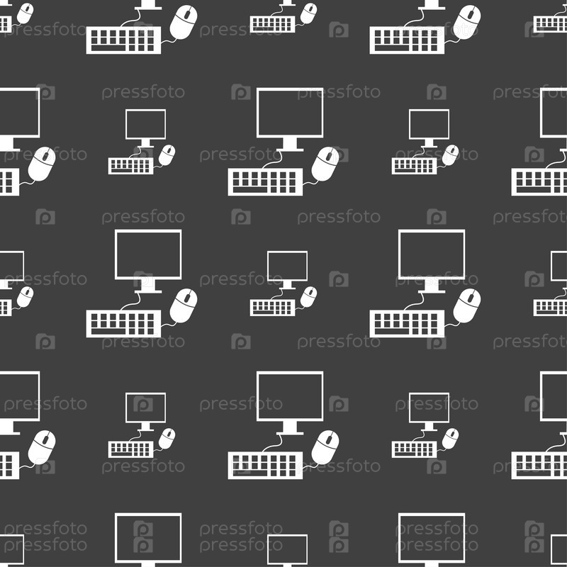 Широкоформатный монитор, клавиатура, мышь знак значок. Бесшовный узор на сером фоне. Вектор