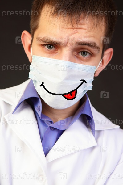Портрет врача в марлевой маске с нарисованным языком