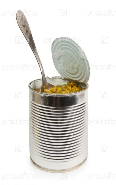 Открытая железная банка с консервированным горошком и ложкой, изолированная на белом фоне