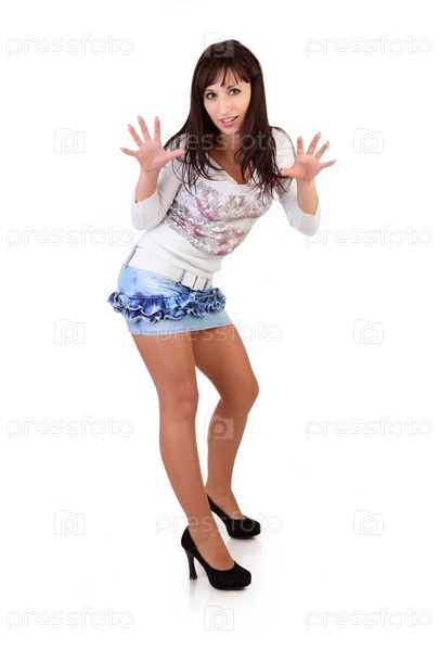 Красивая брюнетка показывает когти рук, изолированная на белом фоне