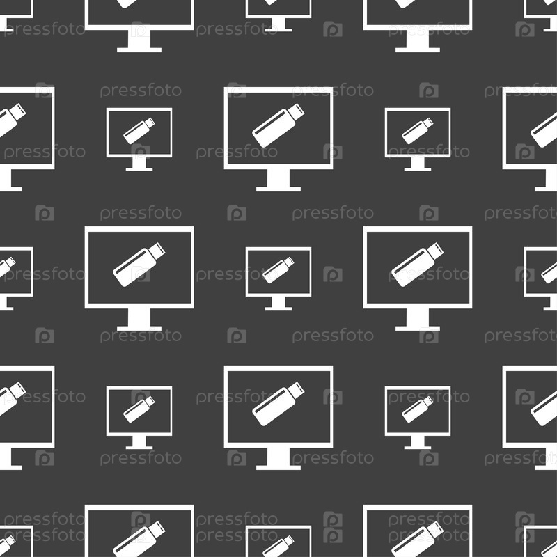 Флэш-накопитель USB и знак монитора значок. Символ видеоигры. Бесшовный узор на сером фоне. Вектор