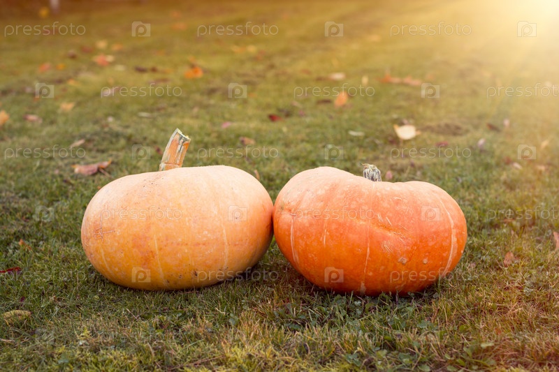 Осенние тыквы с кленовыми листьями на зеленой траве