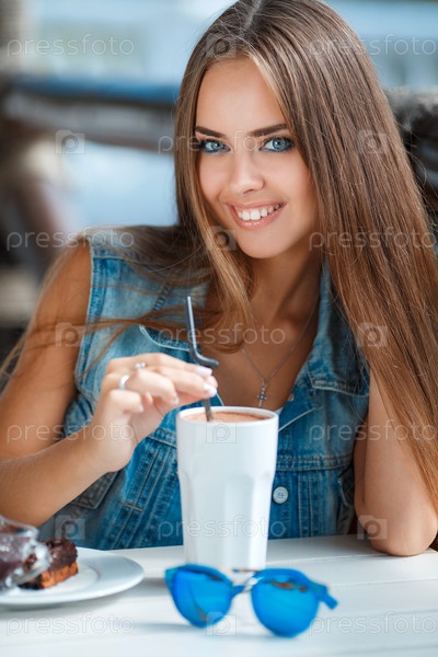 Красивая брюнетка в кафе