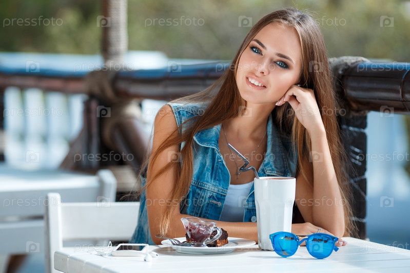 Красивая брюнетка в кафе