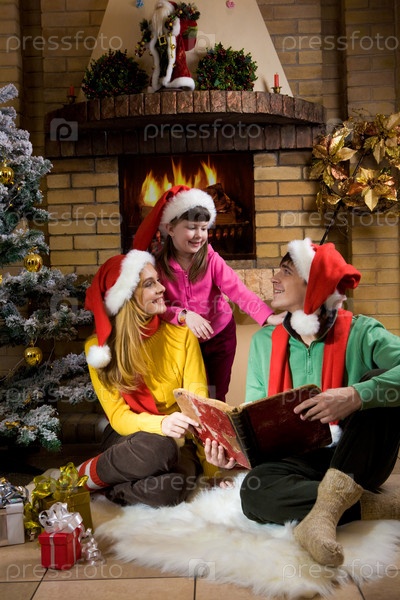 Портрет веселой семьи, сидящей на белом мехе и читающей старую книгу с украшенной ёлочью рядом