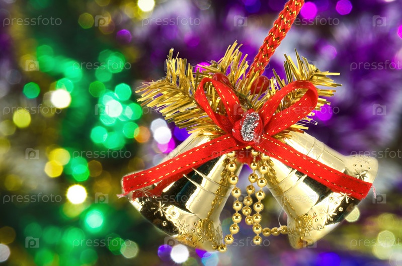 Рождественские колокольчики с красной лентой на фоне с блестками