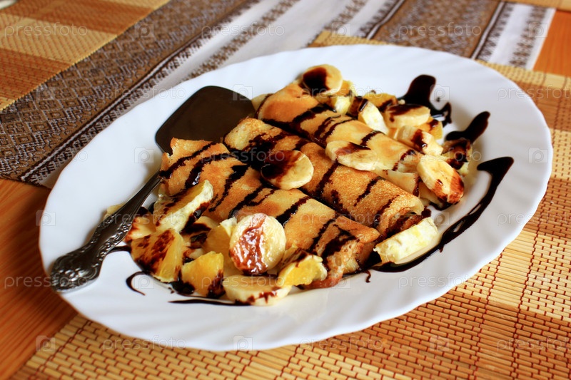 Блины, фаршированные с манной, бананы и апельсины залитые темный шоколад