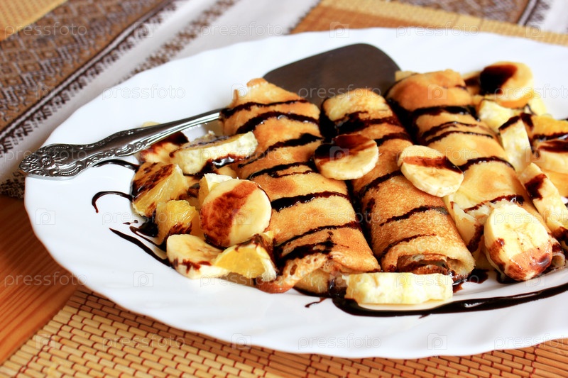 Блины, фаршированные с манной, бананы и апельсины залитые темный шоколад