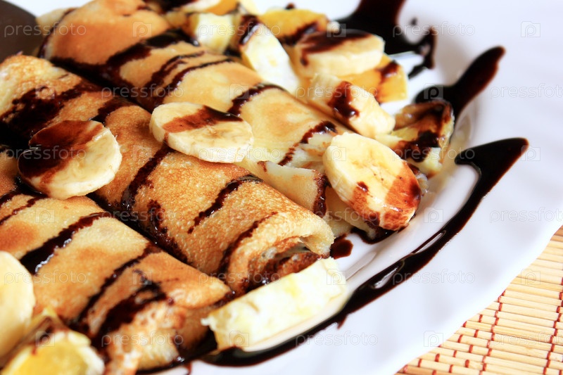 Блины, фаршированные с манной, бананы и апельсины залитые темный шоколад