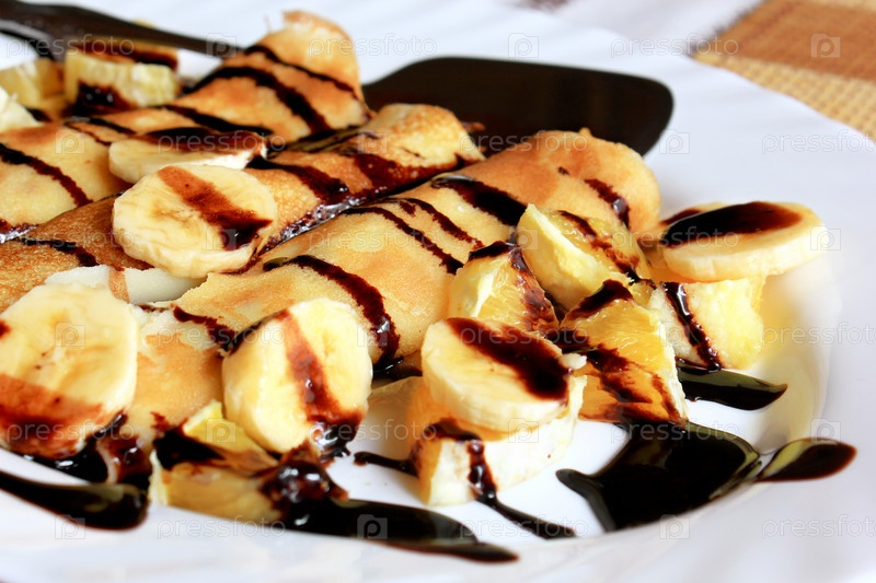 Блины, фаршированные с манной, бананы и апельсины залитые темный шоколад