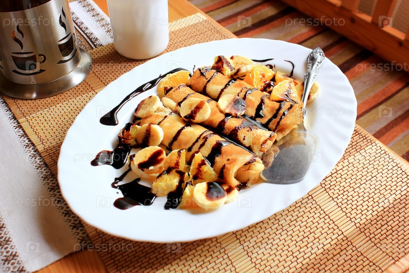 Блины, фаршированные с манной, бананы и апельсины залитые темный шоколад