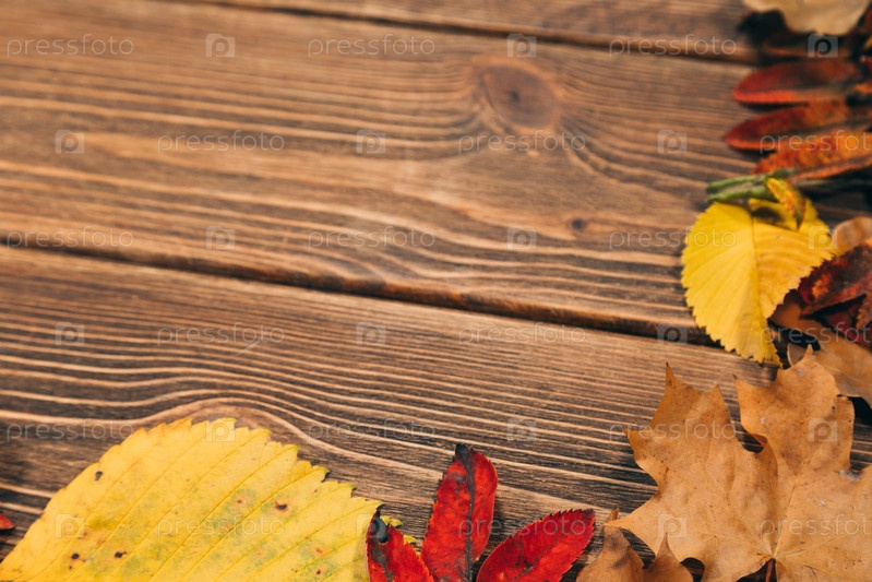 Фон с деревянным столом и осенних листьев