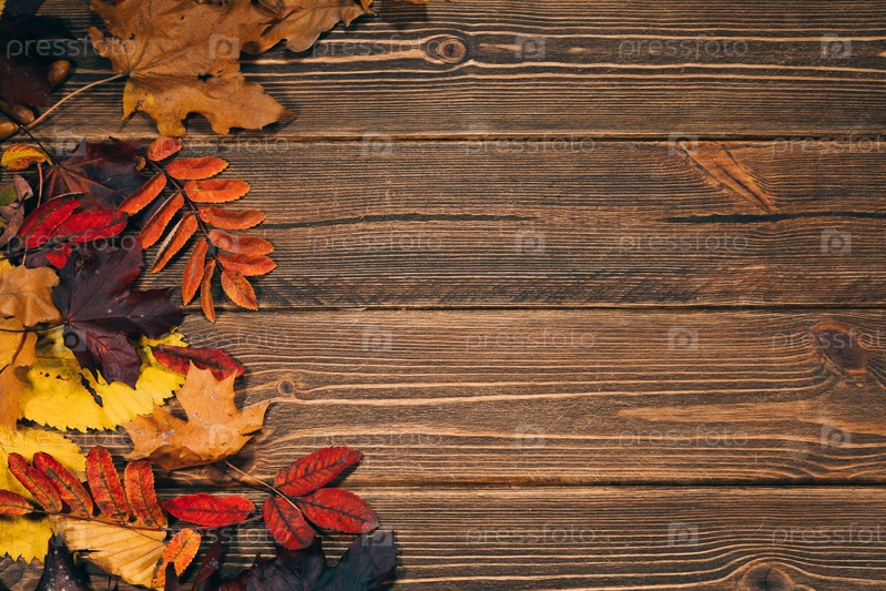 Фон с деревянным столом и осенних листьев
