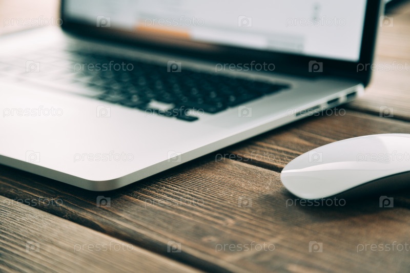 Рабочее место с открытым ноутбук на современный деревянный стол