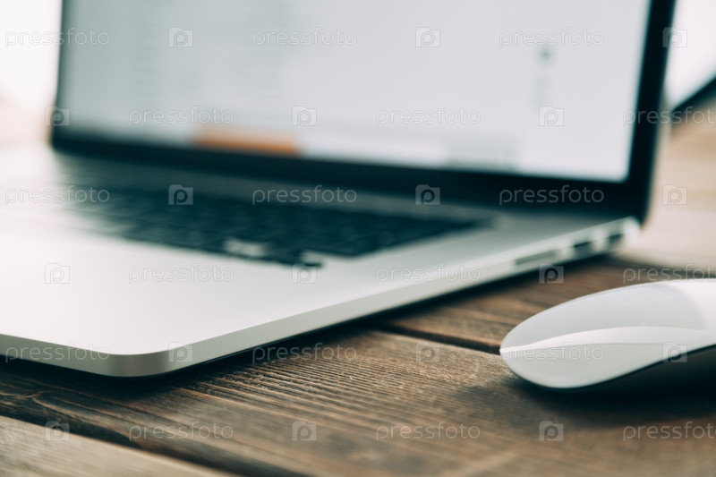 Рабочее место с открытым ноутбук на современный деревянный стол