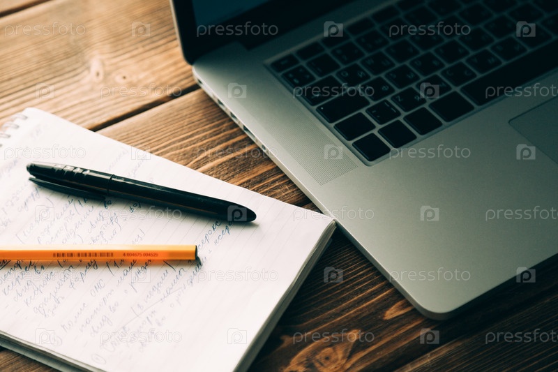Рабочее место с открытым ноутбук на современный деревянный стол