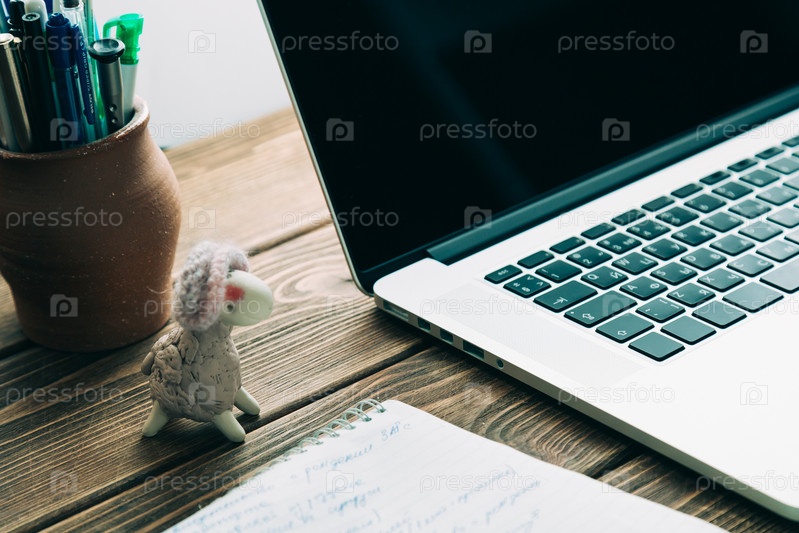 Рабочее место с открытым ноутбук на современный деревянный стол