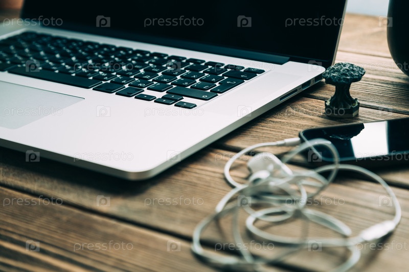 Рабочее место с открытым ноутбук на современный деревянный стол