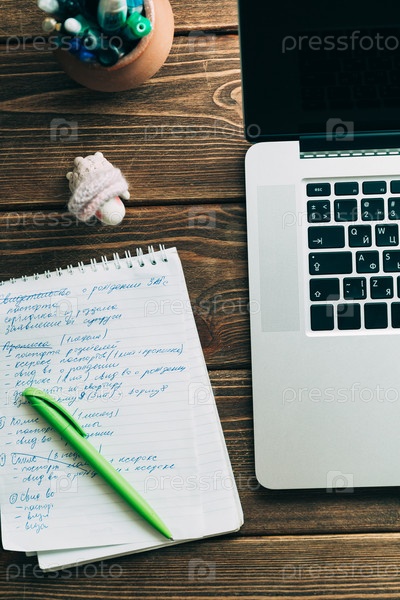 Рабочее место с открытым ноутбук на современный деревянный стол