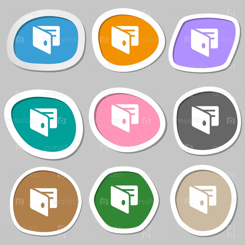Электронный кошелек, электронный кошелек, Визитница значок символов. Разноцветные бумажные наклейки. Вектор