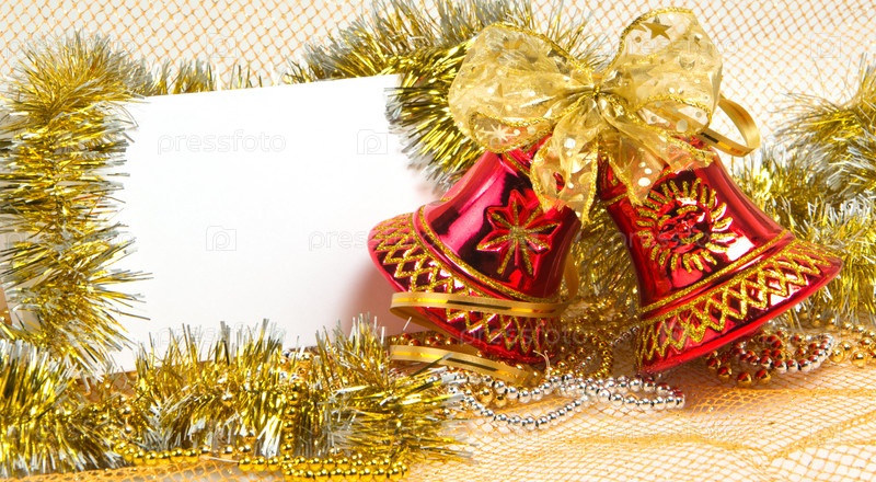Пустая открытка с местом для текста, украшенная мишурой и красными колокольчиками с бантом