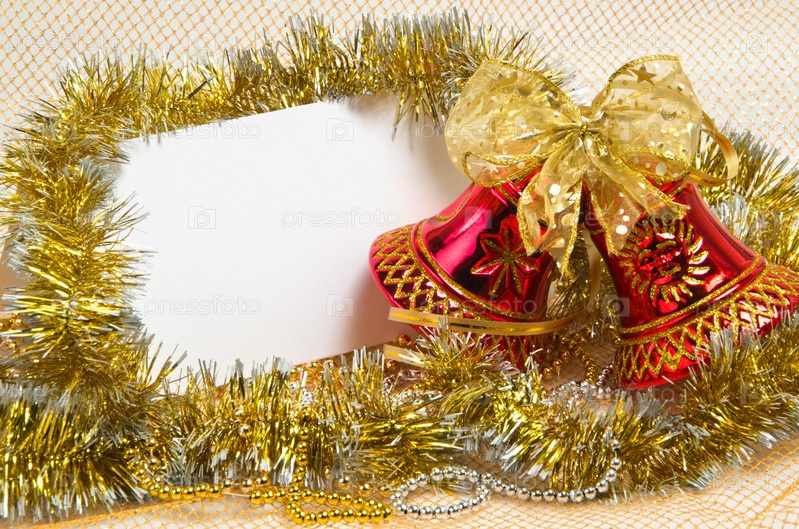 Пустая открытка с местом для текста, украшенная мишурой и красными колокольчиками с бантом