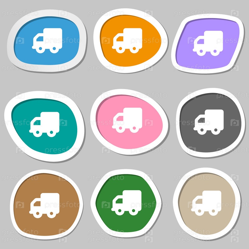 Грузовик доставки значок символы. Разноцветные бумажные наклейки. Вектор