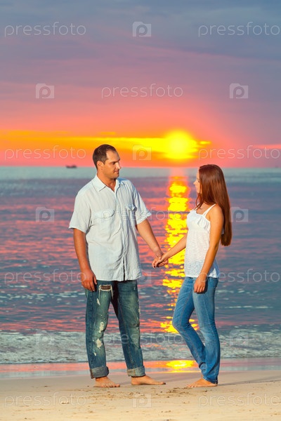 Влюбленная пара гуляет по пляжу на закате