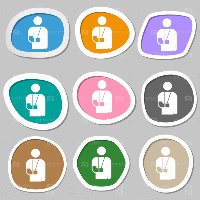 Сломана рука, инвалидности значок символов. Разноцветные бумажные наклейки. Вектор