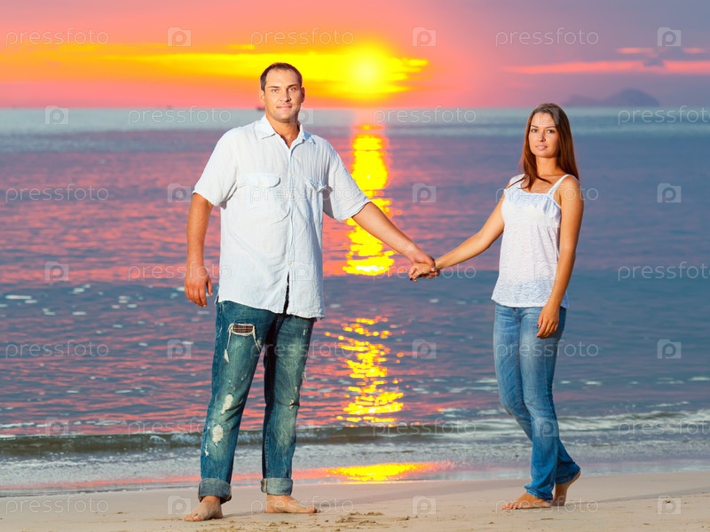 Влюбленная пара гуляет по пляжу на закате