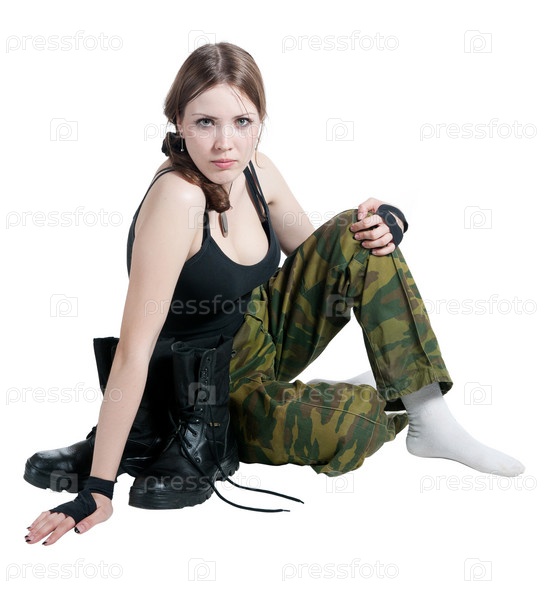 Девушка сидит на полу в военной форме, на белом фоне
