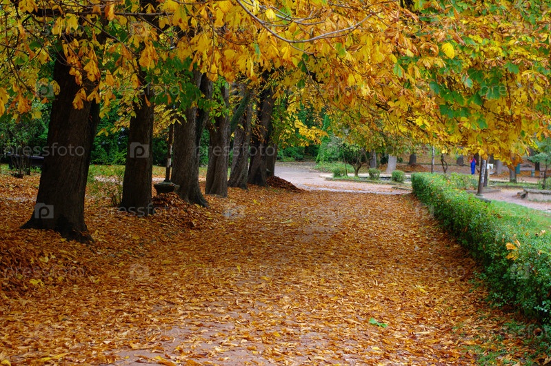 Тропинка усыпанная осенними, желтыми листьями деревьев