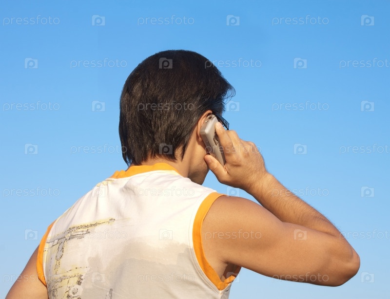 Мужчина разговаривает по мобильному телефону на фоне неба