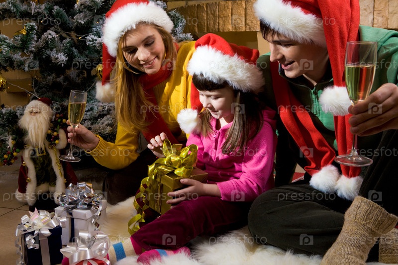Фото счастливых членов семьи, смотрящих на красивую подарочную коробку в девочке