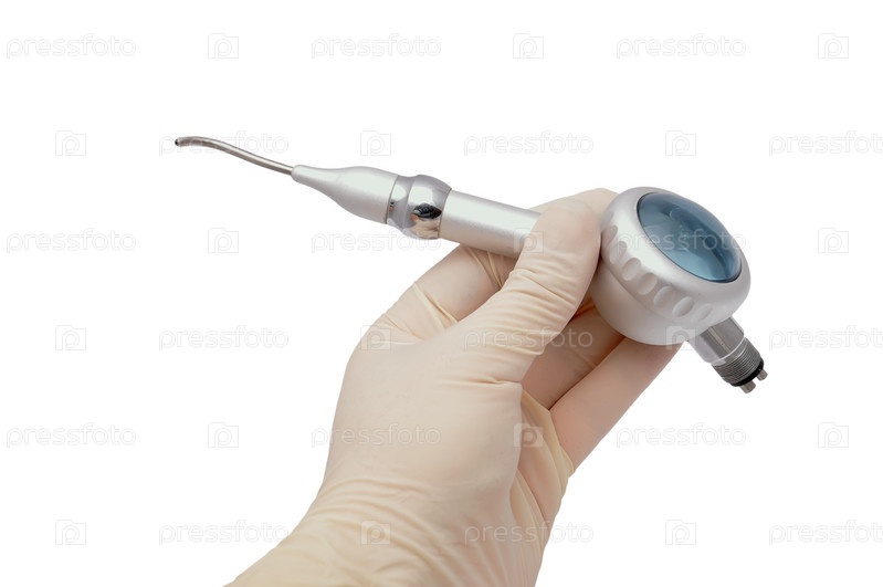 Стоматологический пескоструйный аппарат на белом фоне в руке