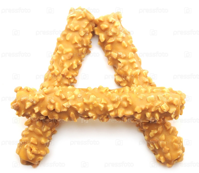 Буква "А" из вафель с орехами на белом фоне