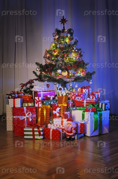 Новогодняя елка и куча подарков в темной комнате